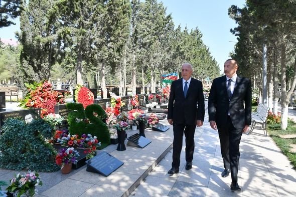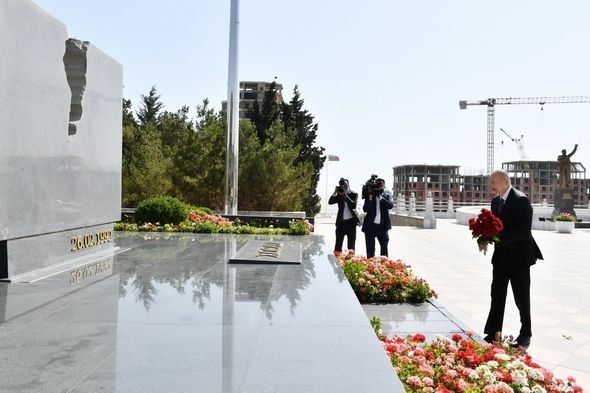 AZƏRTAC xəbər verir ki, dövlətimizin başçısı əvvəlcə Şəhidlər xiyabanında ucaldılmış Qalib Əsgər abidəsinin və Xocalı faciəsi qurbanlarının xatirəsinə həsr olunan abidənin önünə gül dəstələri qoydu.