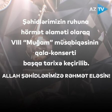Bildirilib ki, şəhidlərimizin ruhuna hörmət əlaməti olaraq VIII “Muğam” müsabiqəsinin qala-konserti başqa tarixə keçirilib.