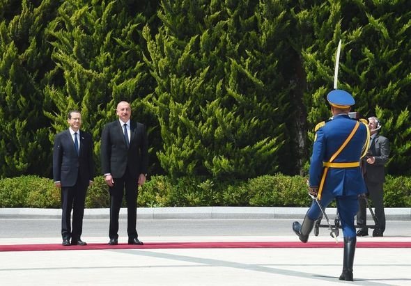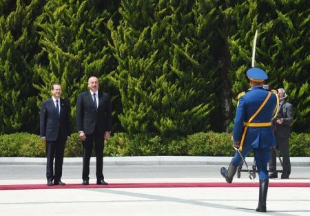 azturktv.az xəbər verir ki, hər iki ölkənin dövlət bayraqlarının dalğalandığı meydanda İsrail prezidentinin şərəfinə fəxri qarovul dəstəsi düzülüb.