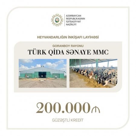 İqtisadiyyat Nazirliyinin Sahibkarlığın İnkişafı Fondu heyvandarlığın inkişafı layihəsi üçün 200 min manat məbləğində güzəştli kredit ayırıb.