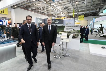 Sonra Prezident İlham Əliyev Bakı Ekspo Mərkəzinin qarşısında nümayiş etdirilən hərbi məhsullara və texnikalara baxdı.