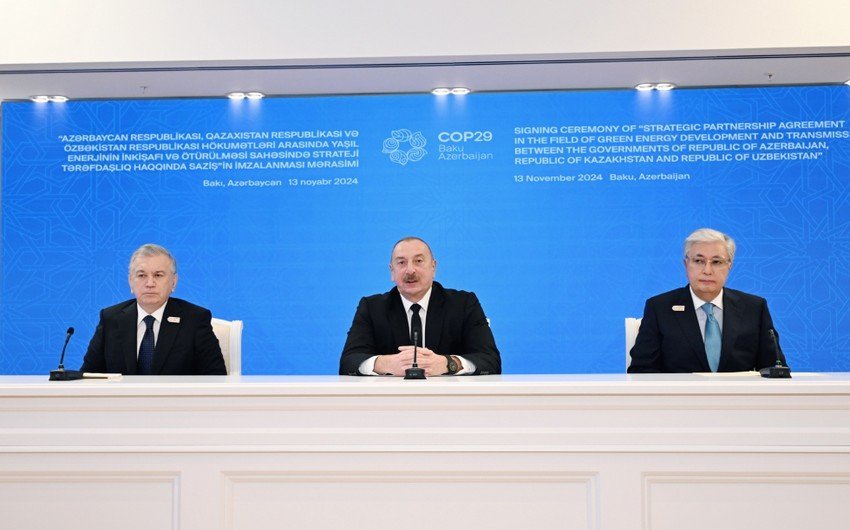 Dünən konfransdakı çıxışımda Azərbaycandan Qara dənizin dibi ilə Avropaya kabel xətti çəkməsi ilə bağlı ölkəmizin artıq həyata keçirilməkdə olan planlarından danışdım. Bu layihənin texniki-iqtisadi əsaslandırılması tamamlanmaq üzrədir və bununla da biz Mərkəzi Asiyanı, Qafqazı, Avropanı, Xəzər və Qara dənizləri vahid enerji dəhlizi ilə birləşdirəcəyik. Xüsusilə sevindirici haldır ki, bu Saziş hər zaman bir-birinə yaxın olan üç qardaş ölkə arasında imzalanır. Özbəkistanla münasibətlərimiz bu il müttəfiqlik münasibətləri səviyyəsinə çatıb, müvafiq saziş imzalanıb. Qazaxıstanla artıq uzun müddətdir ki, strateji tərəfdaş kimi əməkdaşlıq edirik. Qarabağın bərpasında bizə ilk yardım edən ölkələr Özbəkistan və Qazaxıstandır. Füzulidə Mirzə Uluqbəy adına məktəb, Kurmanqazı adına yaradıcılıq mərkəzi bu gün qardaşlığımızın bariz sübutudur. Əminəm ki, biz gələcəkdə də həmişə bir yerdə olacağıq və bir-birimizi dəstəkləyəcəyik. Əziz dostlarım, qardaşlarım Şavkat Miromonoviçə, Kasım-Jomart Kemeleviçə COP29-da iştirak etdiklərinə və öz iştirakları və dəyərli fikirləri, mesajları ilə tədbirimizi zənginləşdirdiklərinə görə minnətdaram.