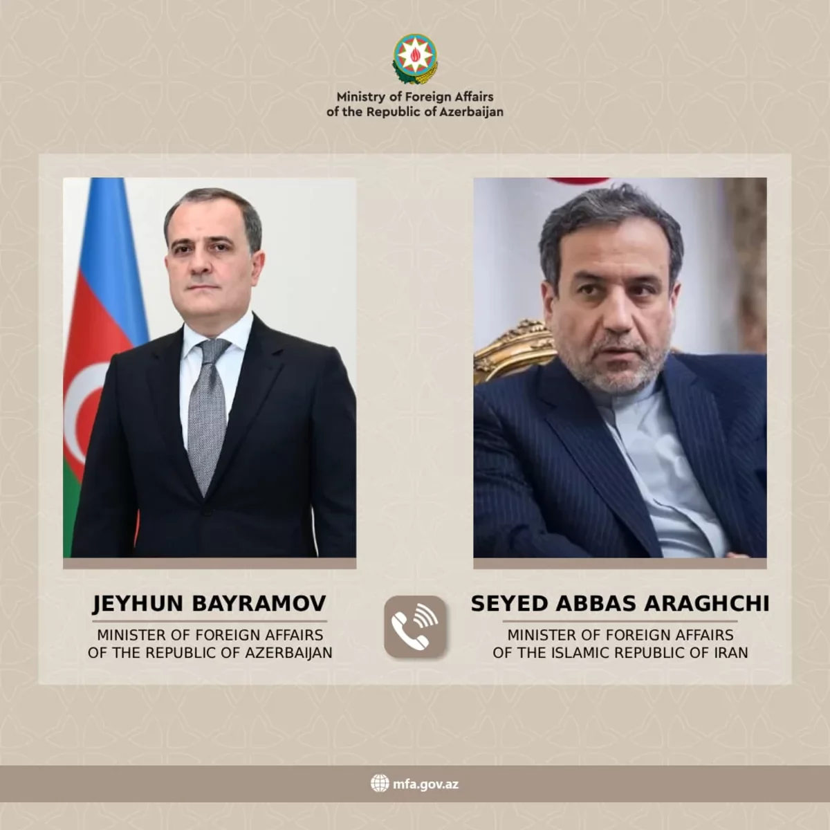 1 mart 2026-cı il tarixində Azərbaycan Respublikasının xarici işlər naziri Ceyhun Bayramov ilə İran İslam Respublikasının xarici işlər naziri Seyid Abbas Ərağçi arasında telefon danışığı baş tutub.