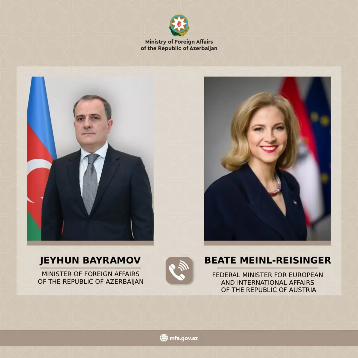 Avstriyanın Avropa və beynəlxalq məsələlər üzrə federal naziri Beate Maynl-Rayzinger Azərbaycanın xarici işlər naziri Ceyhun Bayramova zəng vurub.